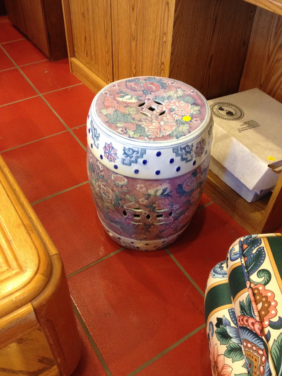 Great merchandise moves fast in thrift stores. Sometimes it's sold the minute the staff sets it out on the floor. So, the more you go, the more you find good stuff. I do a quick 'pop in' a couple times a week at key times, which means I quickly dart around the store for about 5 minutes to see if there's anything there. For example, I went to my favorite store on Friday and didn't find a thing. Then yesterday, I went in and found this little gem for about $5. I've been wanting a garden stool for ages, but could never find one under $100 even at discount stores.