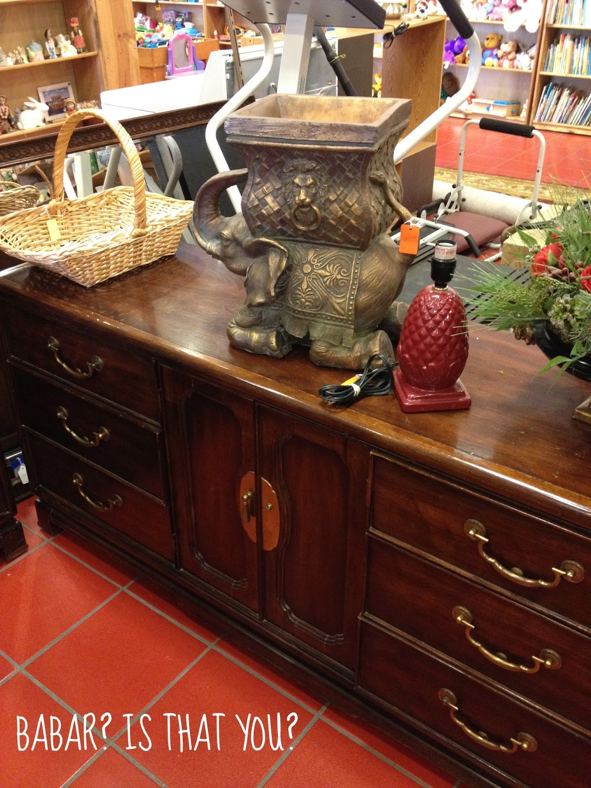 Ahhh! Love the elephant! Also love the buffet it's on! My SIL got one (exactly like this one!!) at Salvation Army on sale for 75% off so I think it came to somewhere around $35. We painted the hardware with black hammered metal spray paint, and painted the buffet a deep burgundy red and it looks amazing in her dining room! It was a tv stand for a while but doesn't fit in her new living room :(.