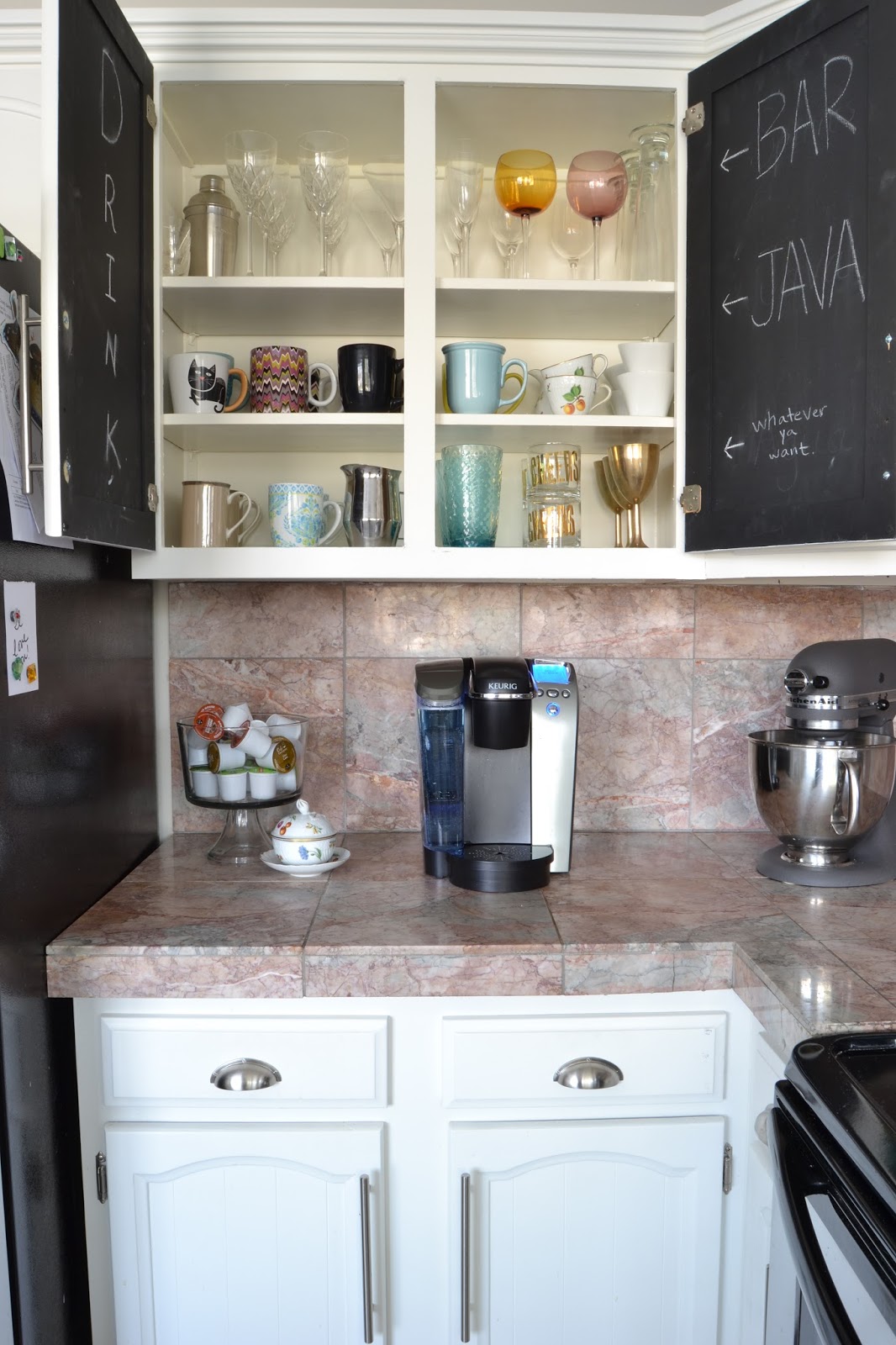 DeleteHi Virginia, I see you have a Keurig. I didn't want to spend $30 on a k cup holder so I thrifted a wooden spice rack. The kind that turns like a lazy susan and has the perfect size holes for k-cups. Just add paint and voila. Maybe you'll give it a try. If you do I'd love to see it :)