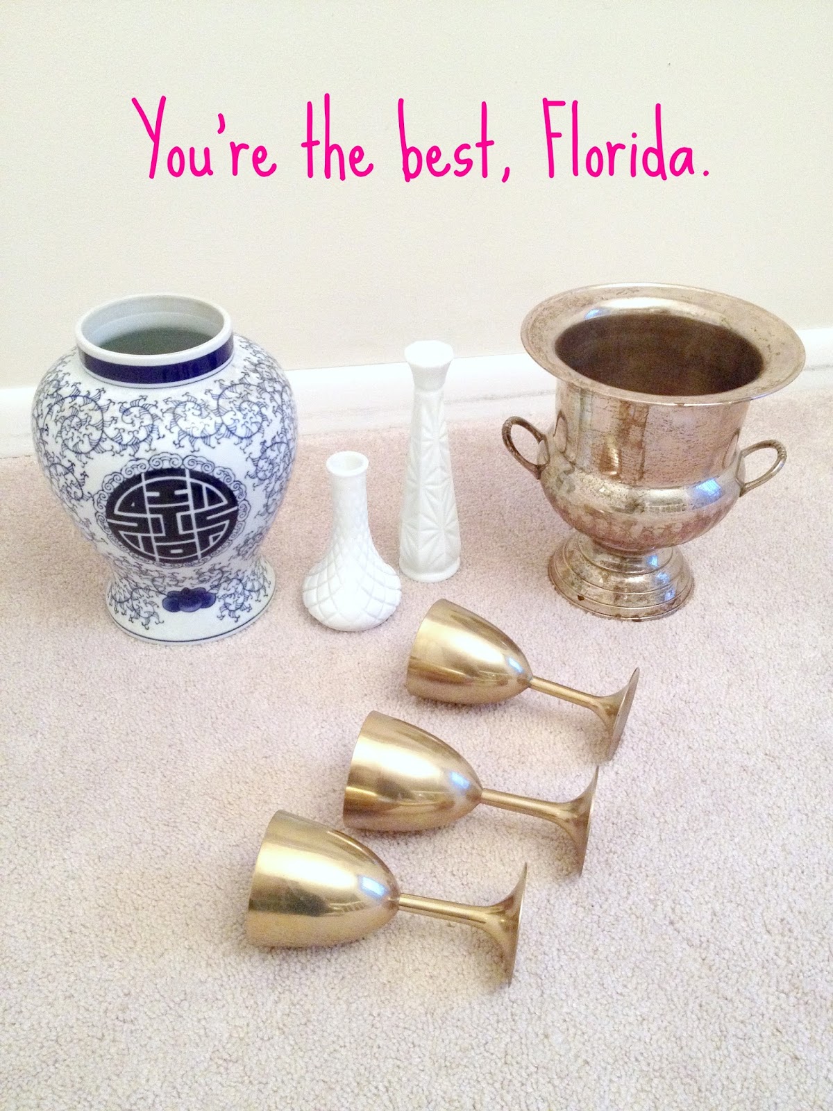 I brought home a ginger jar, two milk glass vases, a silver champagne bucket, and three bronze wine glasses.